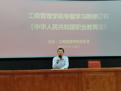 5月10日,工商管理學院在學術交流中心一樓3D導遊實訓室召開全院教職工大會,專題學習新修訂的《中華人民共和國職業教育法》。學院黨總支書記俞彤主持學習。